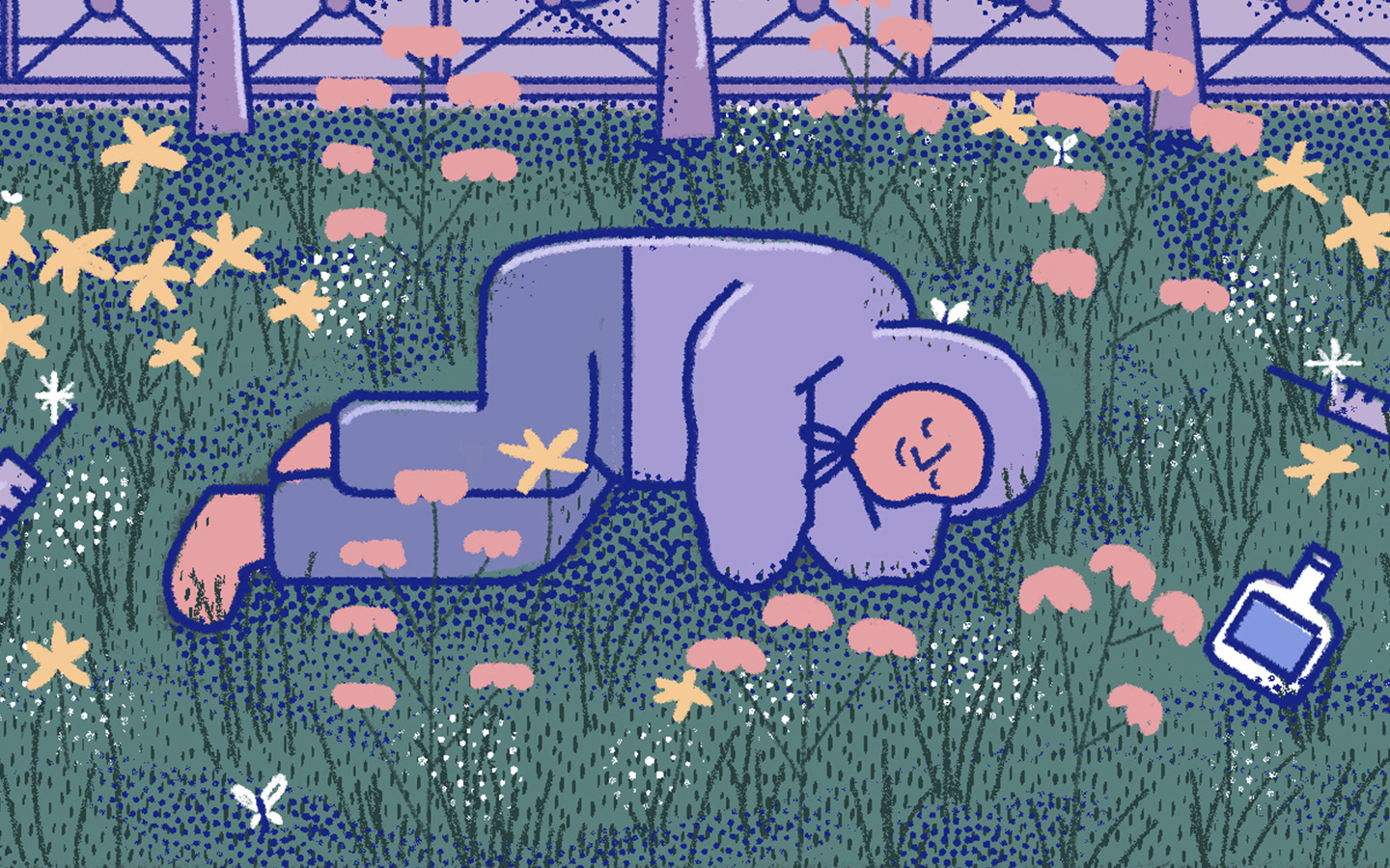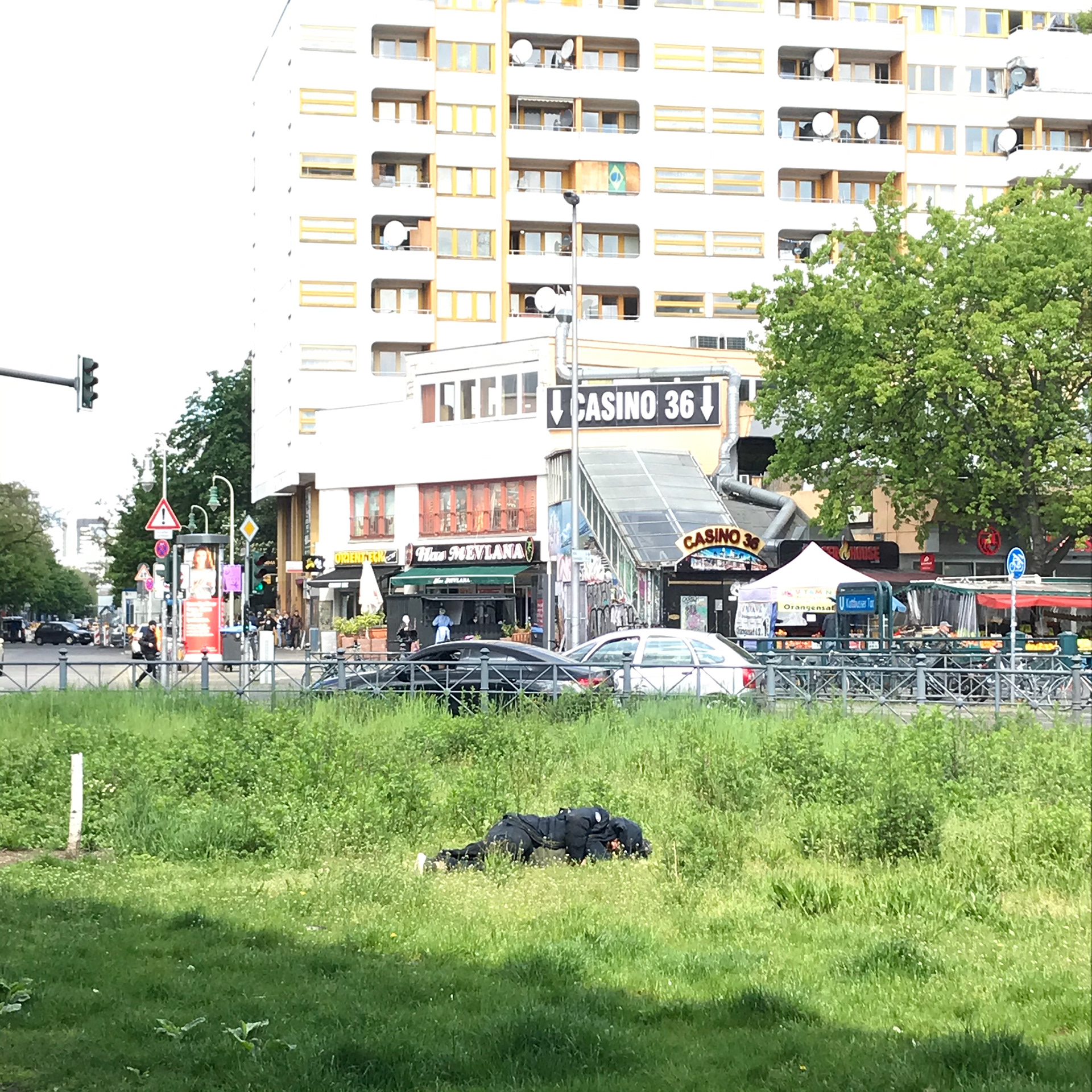 Kottbusser Tor is my one of my local stations in Berlin and probably one of the least desirable places I like to be in the world. Getting off the bahnhof and seeing this horribly misplaced human being placed in the middle of the grass was both beautifully composed and yet tragic. It has become the norm to accept this kind of image in Berlin, where it is often the better option to avoid such scenes by turning a blind eye. Ironically the composition is set on an island with beautiful wild flowers, butterflies and woven with used needles & metal foil (used for smoking heroin).